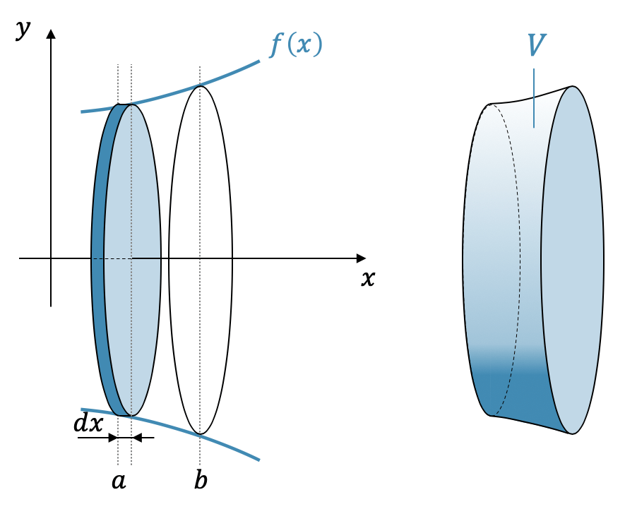 \[ V = \pi \int_a^b f^2(x)\;dx \]