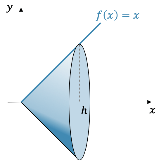 Berechne das Volumen eines Kegels, der durch die Rotation von \(f(x)=x\) von \(0\) bis \(h\) entsteht.