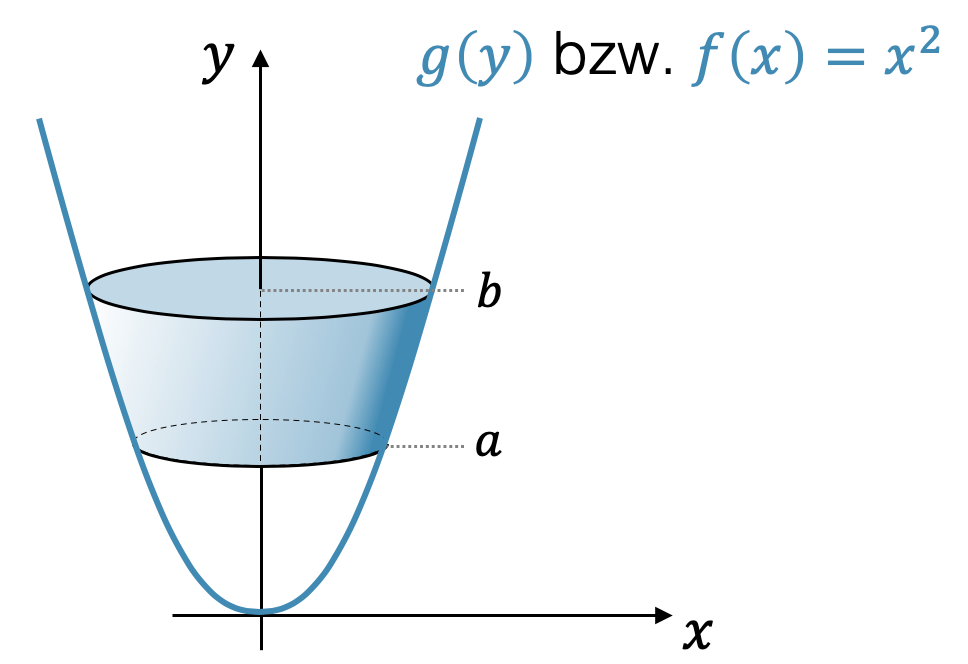 Das Problem ist nur, dass wir eine Funktion brauchen, deren Argument die Achse ist, um die wir rotieren. Für eine Rotation um die \(x\)-Achse ist es eine Funktion \(f\) von \(x\), für eine Rotation um die \(y\)-Achse ist es eine Funktion \(g\) von \(y\). Was ist die Funktion \(g(y)\), wenn wir \(f(x)=x^2\) haben? Es ist genau die Umkehrfunktion:
