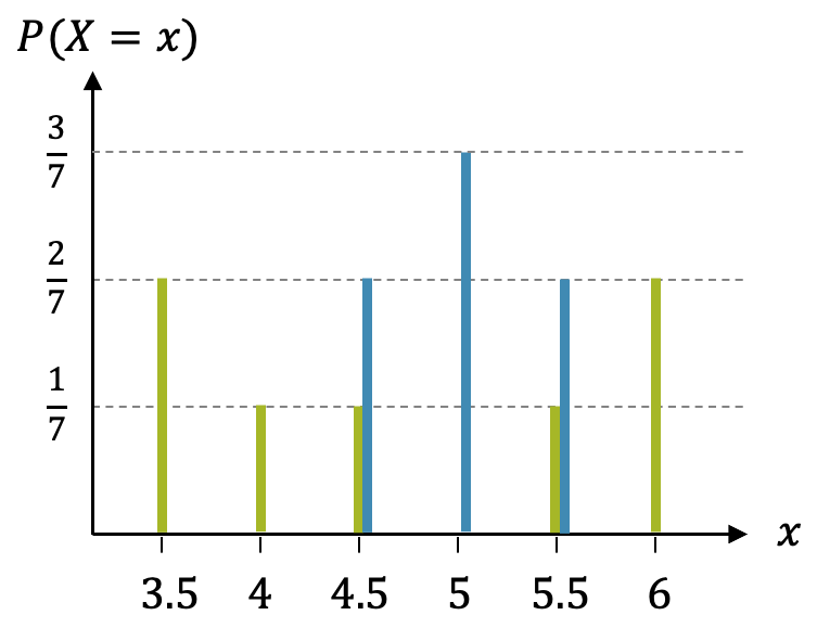 \[ \overline{x}_A = \frac{2}{7} \cdot 3.5 + \frac{1}{7} \cdot 4 + \frac{1}{7} \cdot 4.5 + \frac{1}{7} \cdot 5.5 + \frac{2}{7} \cdot 6 \]