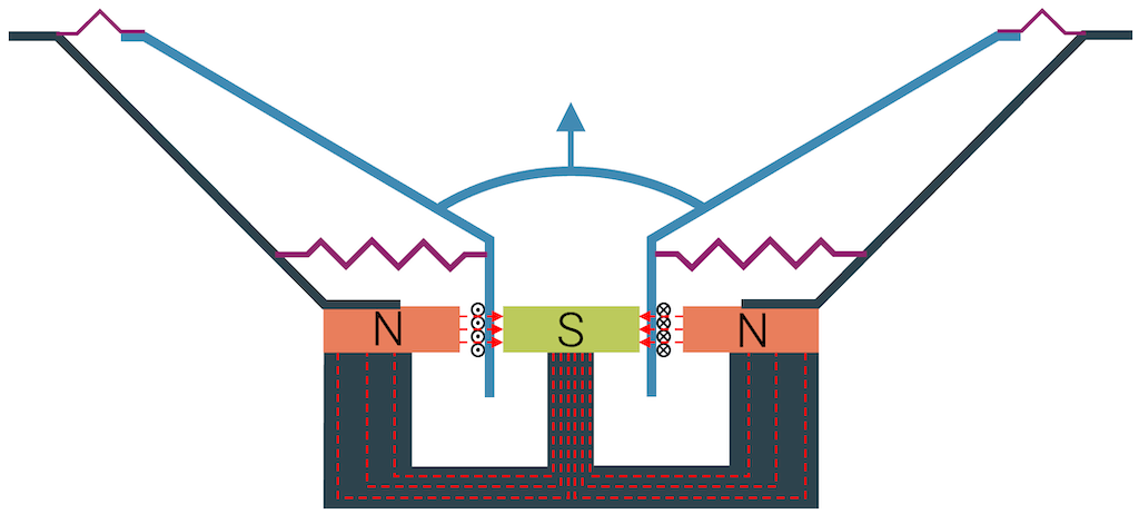 Der Lautsprecher hat einen relativ starken, meist ringförmigen Permanentmagneten. In der obigen Skizze ist der zentrale Bereich der Südpol des Magneten und der äussere Ring entspricht dem magnetischen Nordpol. Im zylindrischen Zwischenraum, zwischen Nord- und Südpol, herrscht ein Magnetfeld, dessen Feldlinien radial nach innen zeigen.