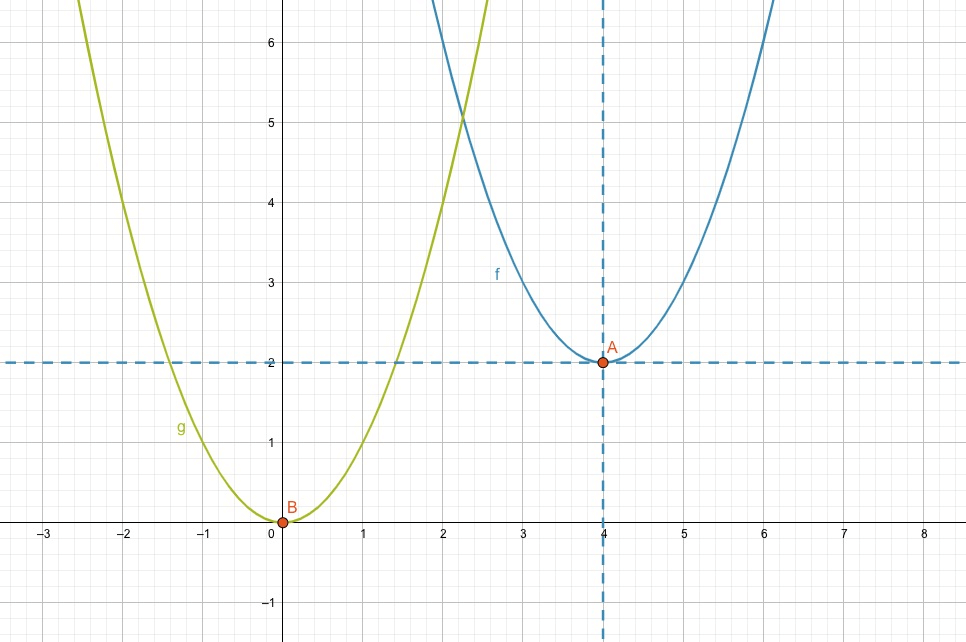 Eigentlich sind beide Parabeln gleich, mit dem Unterschied, dass die blaue Parabel um den Betrag 4 nach rechts und um den Betrag 2 nach oben verschoben worden ist. Mit anderen Worten: Wenn wir das blau gestrichelte Koordinatensystem nehmen würden mit den Koordinaten \(x’\) und \(y’\), die durch den Scheitelpunkt gehen, hätten wir die folgende Gleichung für die blaue Parabel: