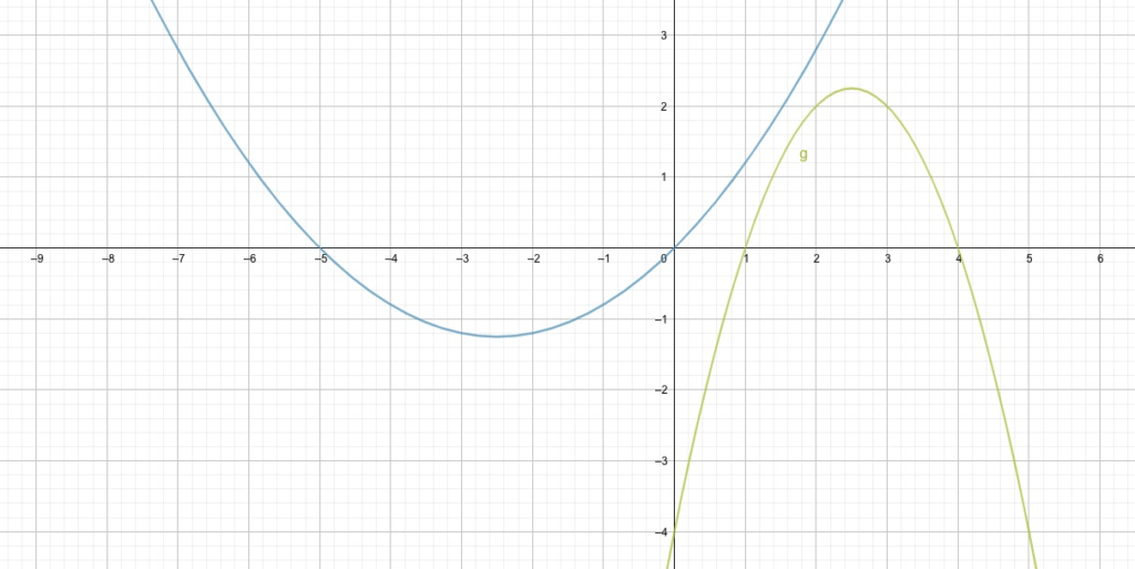 Wie erwartet, ist die grösste vorkommende Potenz \(x^2\). Wir sehen, dass der Faktor vor dem \(x^2\) eine positive Zahl ist, nämlich \(\frac{1}{5}\). Deshalb ist die Parabel aufrecht. Ausserdem ist dieser Faktor kleiner als 1. Das macht die Parabel ”breit” oder ”flach gedrückt”. Von besonderem Interesse sind die sog. Nullstellen, d.h. die Stellen, an welchen die Parabel die \(x\)-Achse schneiden. Die blaue Parabel hat die Nullstellen \(x=-5\) und \(x=0\).