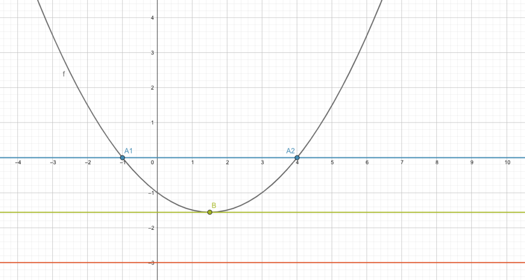 Die Höhe \(y=-3\) ist in der Abbildung rot eingezeichnet. Die Lösung dieser Gleichung ist die leere Menge. Es gibt keinen \(x\)-Wert, der diese Gleichung erfüllen vermag:
