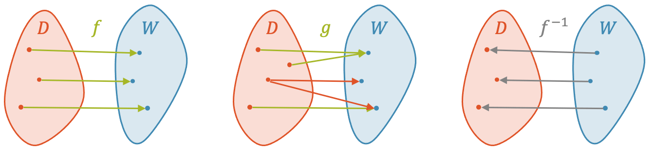 • Ein Wert in \(\boldsymbol{D}\) wird verschiedenen Werten in \(\boldsymbol{W}\) zugewiesen (rot). Das ist nicht zulässig, denn dadurch ist die Zuweisung nicht eindeutig definiert.