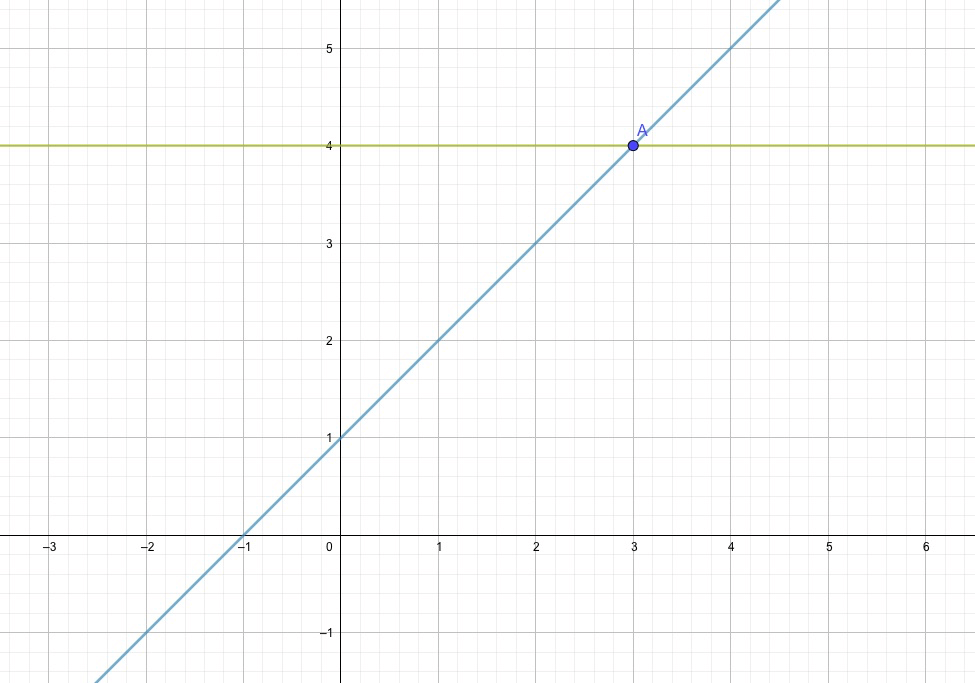 Im Diagramm sind beide Gleichungen eingezeichnet. Die blaue Linie entspricht \(y_1 = x+1\), die grüne Linie \(y_2 = 4\). Die Gleichung \(y_1 = y_2\) fordert jetzt, dass beide \(y\)-Werte gleich seien. Das ist in nur einem bestimmten Punkt erfüllt, dem Punkt Amit den Koordinaten \(A(3,4)\). Wichtig für uns ist die \(x\)-Koordinate. Sie ist die Lösung unserer Gleichung: \(x=3\). Wir haben so die Gleichung grafisch gelöst, mit der grafischen Methode eben.