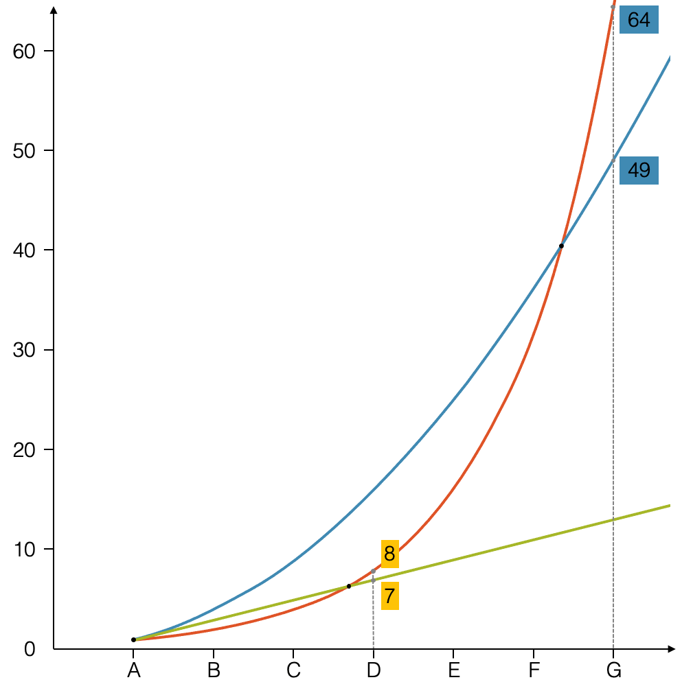 Erst im Punkt D überholt die Exponentialfunktion (rot) die lineare Funktion (grün) und zwischen F und G auch die quadratische Funktion (blau).