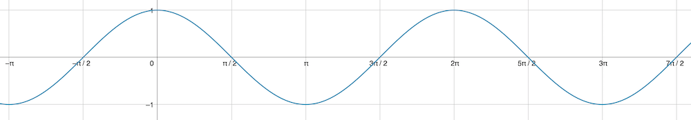 Jetzt übertragen wir die Punkte und vervollständigen den Verlauf. Wir erhalten so die gleiche Auf-Ab-Bewegung zwischen den Schranken -1 und +1. Dieses Mal beginnt die Funktion jedoch bei 1 und ist somit gleich wie die Sinus-Funktion, jedoch um 90° nach links verschoben.