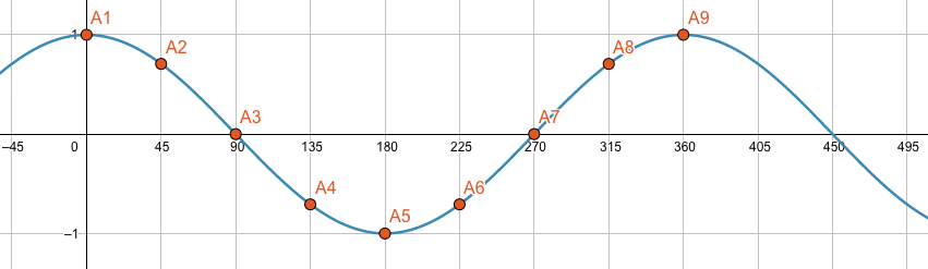 | \(\cos(\alpha)\) | 1 | \(\frac{1}{\sqrt{2}}\) | 0 | \(-\frac{1}{\sqrt{2}}\) | -1 | \(-\frac{1}{\sqrt{2}}\) | 0 | \(\frac{1}{\sqrt{2}}\) | 1 | … |
