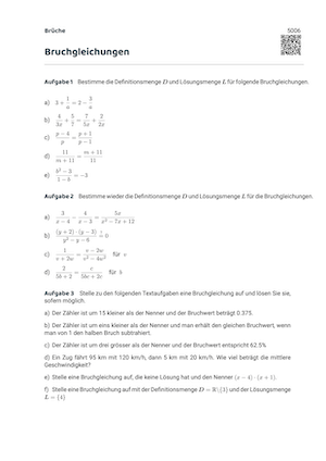 Als Bruchgleichung wird eine Gleichung verstanden, die Bruchterme beinhaltet. Bruchterme sind Brüche mit einer Unbekannten im Nenner. Die Bruchterme können auf einer oder auf beiden Seiten der Gleichung stehen. Nachfolgend zwei Beispiele von Bruchgleichungen mit der Unbekannten \(x\):