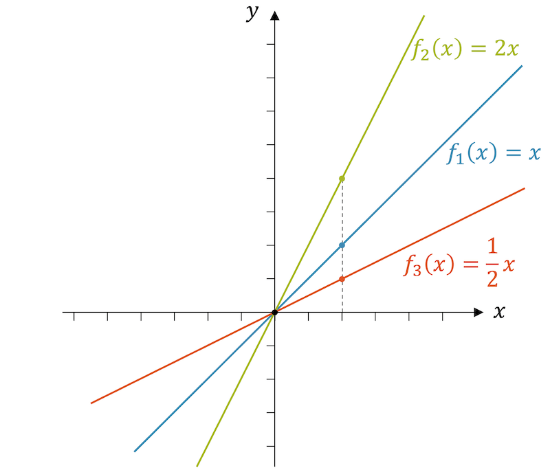 In der obigen Abbildung sind drei lineare Funktionen mit drei verschiedenen Steigungen eingezeichnet. Wir starten mit der blauen Grundgleichung für lineare Funktionen: