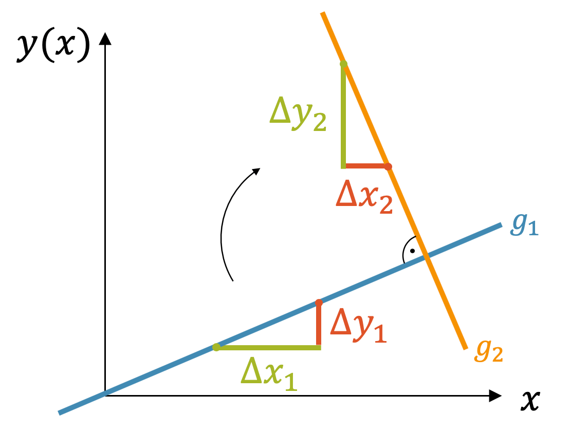 Wenn wir eine Gerade \(g_1\) mit Steigung \(m_1\) um 90° im Uhrzeigersinn drehen, so erhalten wir eine Gerade \(g_2\), die genau senkrecht auf der ersten Gerade steht. Aus dem \(\Delta x_1\) der ersten Gerade wird ein \(\Delta y_2\) der zweiten Gerade. Durch Drehung des \(\Delta y_1\) der ersten Gerade erhalten wir \(-\Delta x_2\) der zweiten Gerade: