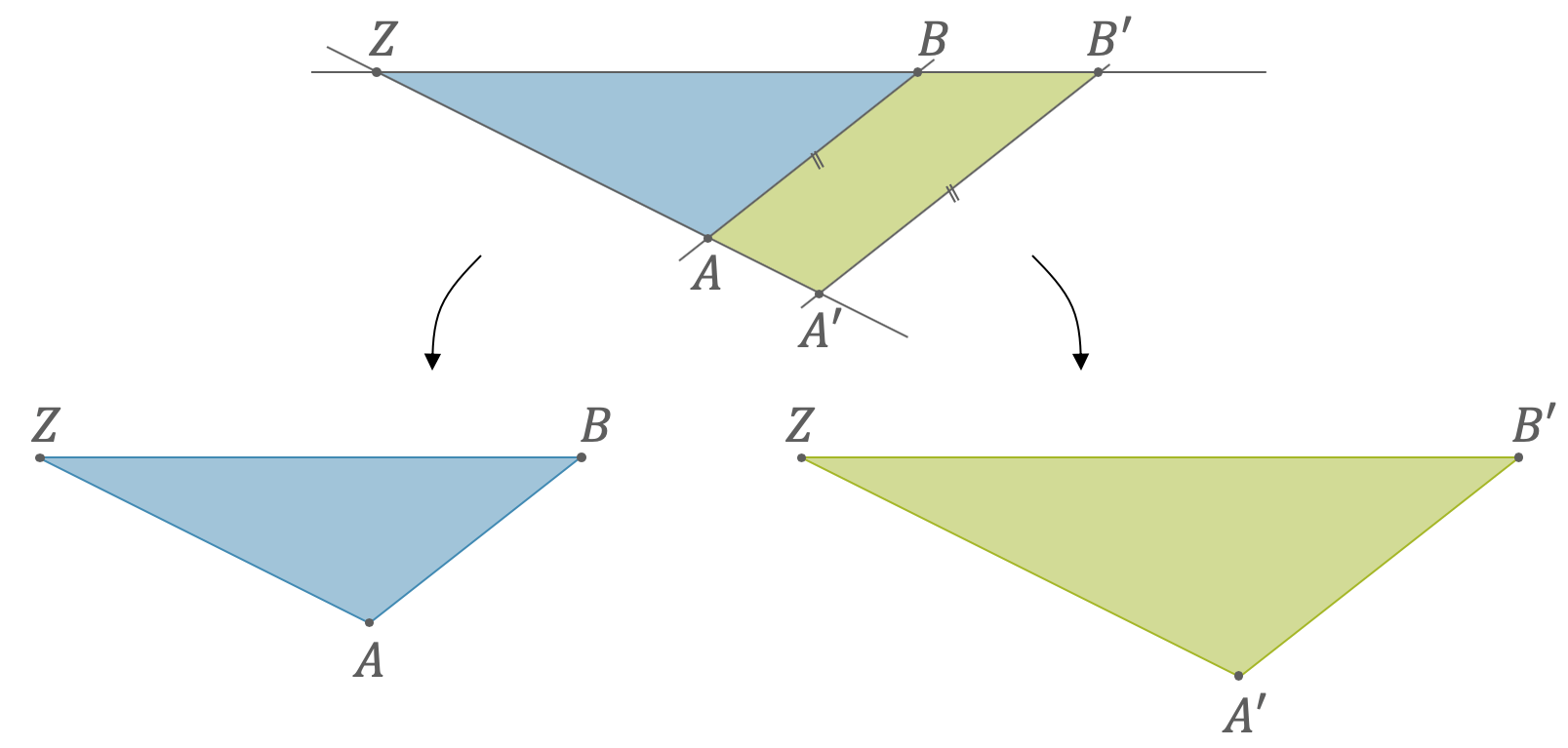 \[ \frac{\;\overline{ZA}\;}{\overline{ZA’}} = \frac{\;\overline{ZB}\;}{\overline{ZB’}} \]