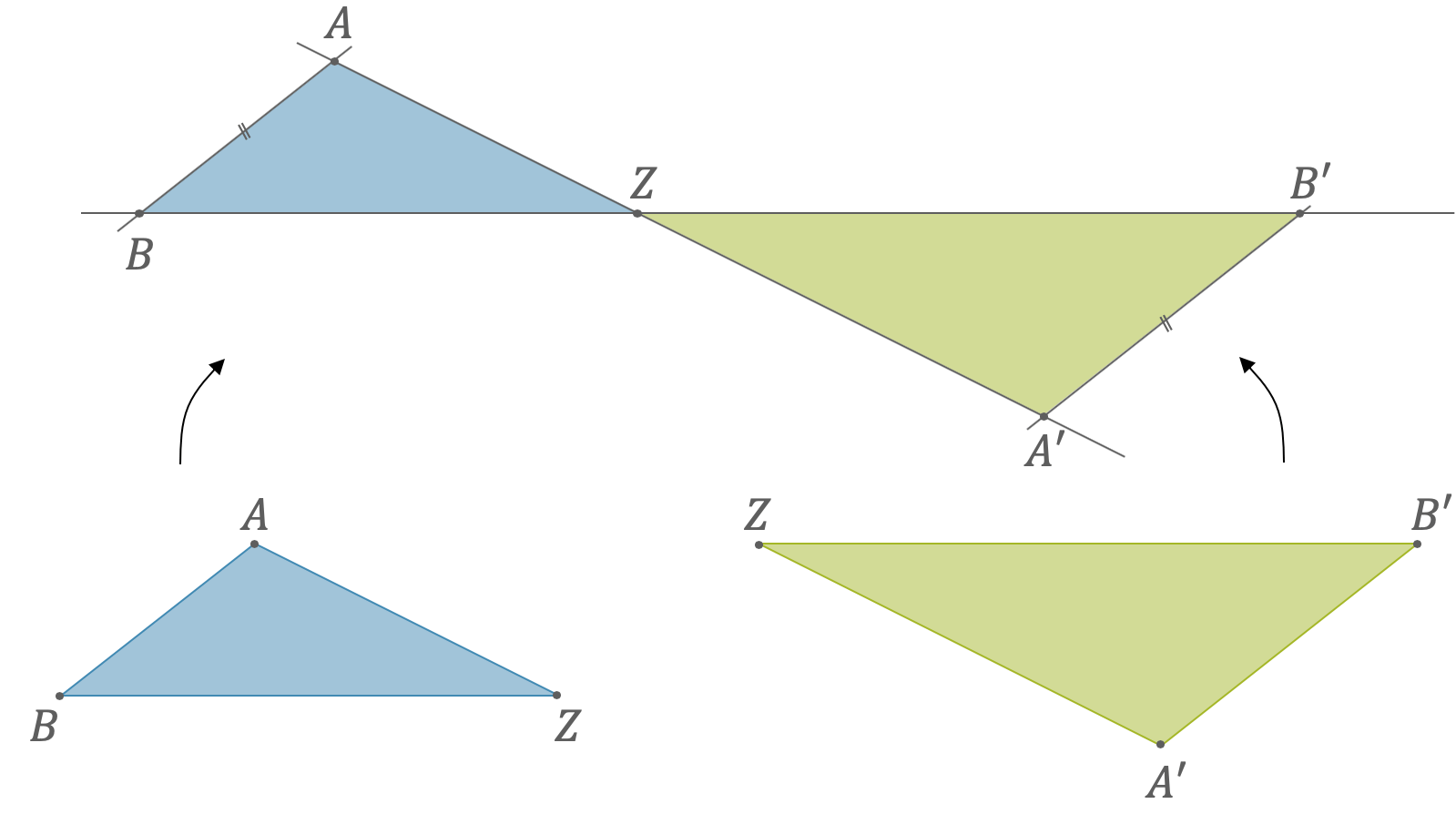 Wenn wir das blaue Dreieck um 180° drehen und wieder zurücksetzen, ist die eine Gerade immer noch parallel zur anderen. Das blaue Dreieck liegt jetzt auf der anderen Seite von \(Z\). Wir können die Strahlensätze deshalb auch auf solche Situationen anwenden, wo die Strahlen links und rechts vom Zentrum durch die beiden parallelen Geraden geschnitten werden.