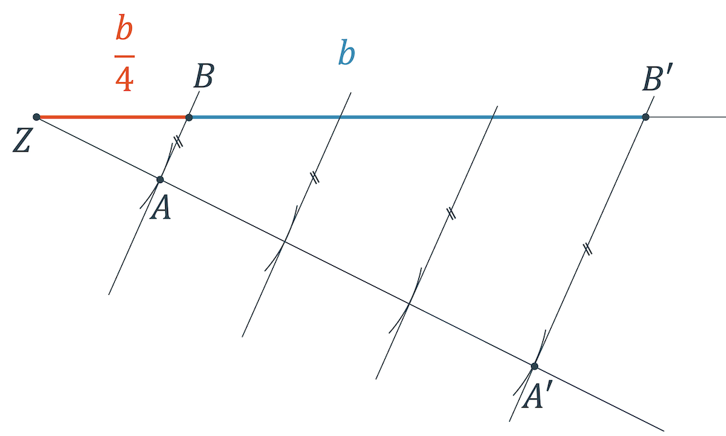 Im Artikel über das Teilen einer Strecke haben wir gelernt, dass eine gegebene Strecke mit Hilfe einer Hilfsgeraden konstruiert werden kann (siehe Abbildung, wo die Strecke durch vier geteilt wird). Wir erkennen, dass die Hilfsgerade als ein zweiter Strahl angesehen werden kann und dass wir auch hier (mindestens) zwei Dreiecke haben: Ein grosses Dreieck mit der blauen Seite (Länge \(b\)) und ein kleines Dreieck mit der roten Seite (Länge \(\frac{b}{4}\)). Das Verhältnis der beiden Seiten ist klar: