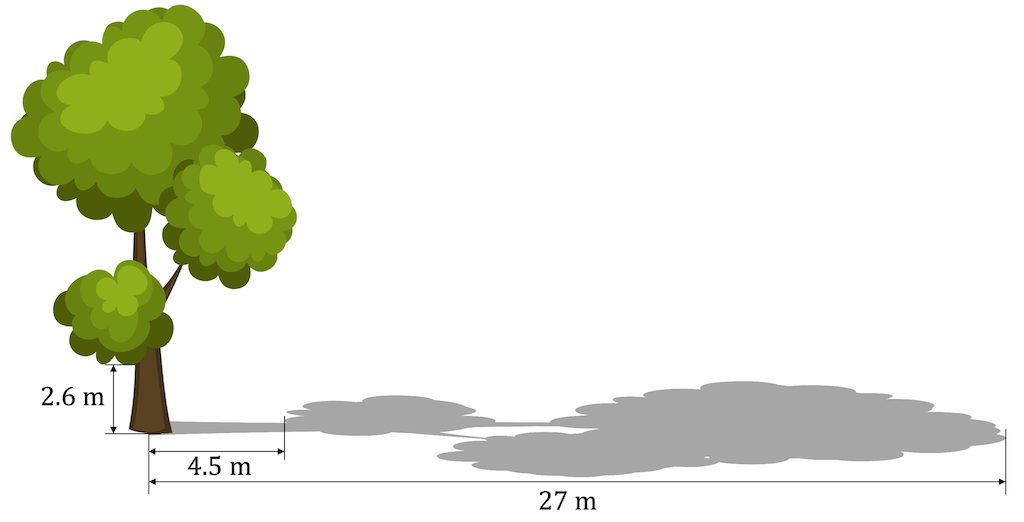 \[ \frac{h}{2.6\;\si{m}} = \frac{27\;\si{m}}{4.5\;\si{m}} \]