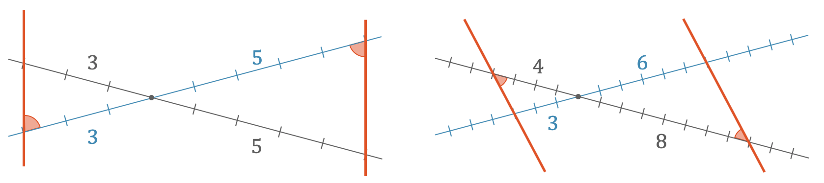 Das funktioniert tatsächlich! In der obigen Abbildung sehen wir, wie in der linken Skizze der blaue Strahl im Verhältnis 3:5 geschnitten wird. Nehmen wir beim anderen Strahl das gleiche Verhältnis, erhalten wir tatsächlich zwei parallele Geraden. Der Grund liegt in der Ähnlichkeit der beiden Dreiecke. Wenn je zwei Seiten eines Dreiecks im Verhältnis stehen, dann ist automatisch auch die dritte Seite im richtigen Verhältnis. Eine weitere Folge ist, dass beide Dreiecke die gleichen Winkel haben müssen.