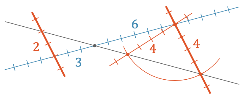 In der folgenden Abbildung sehen wir, wo das Problem liegt. Wir fordern das Verhältnis \(3:2\) bzw. \(6:4\). Für das letzte Stück gibt es aber zwei mögliche Lösungen, die das Verhältnis \(3:2\) bzw. \(6:4\) erfüllen. Tragen wir nämlich die geforderte Länge von 4 mit dem Zirkel ab, kriegen wir zwei Schnittpunkte. Die linke Lösung ist offensichtlich die Richtige – sie ist tatsächlich parallel zur ersten Gerade. Rechts haben wir aber eine sog. Scheinlösung, die definitiv nicht parallel ist.