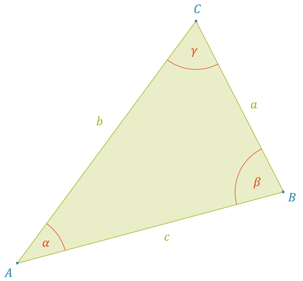 Die Bezeichnungen der Eckpunkte werden typischerweise im Gegenuhrzeigersinn vergeben. Die Winkelbezeichnungen passen normalerweise zu den Bezeichnungen der Eckpunkte \(\alpha\) zu \(A\), \(\beta\) zu \(B\) etc. Die Bezeichnungen der Seiten passen zu den gegenüberliegenden Eckpunkten: \(a\) gegenüber \(A\), \(b\) gegenüber \(B\) etc.