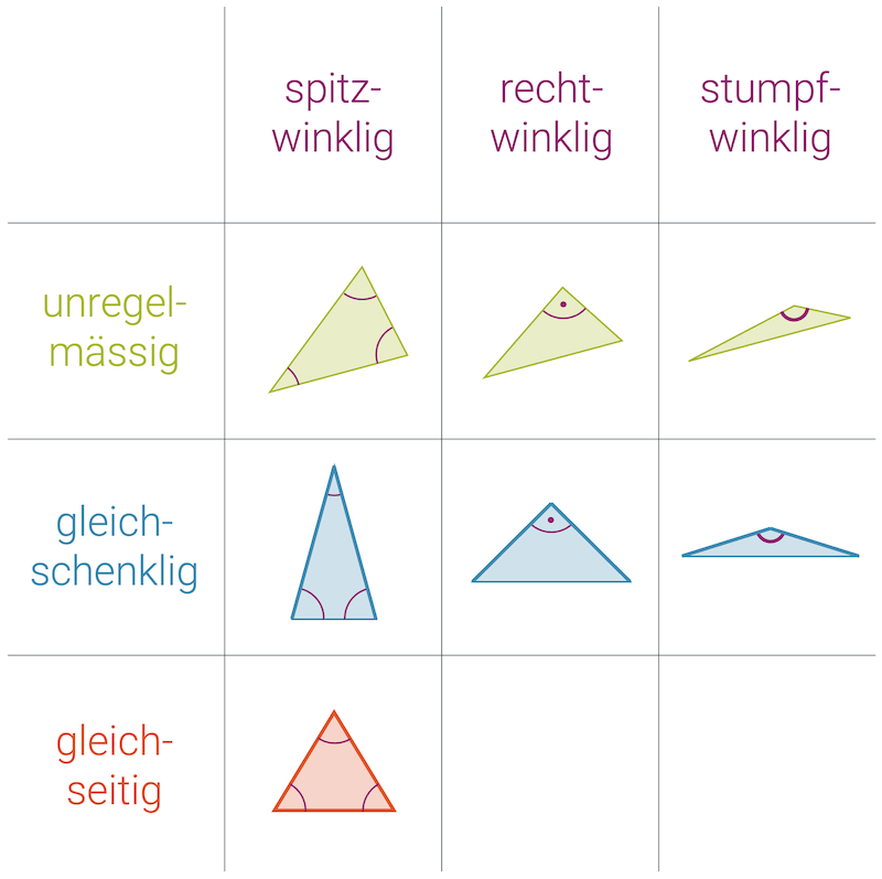 Ein ganz allgemeines Dreieck hat unterschiedlich lange Seiten und spitze Winkel (<90°) und wird deshalb spitzwinklig genannt. Eine sehr wichtige Gruppe der speziellen Dreiecke sind diejenigen, die einen rechten Winkel enthalten. Sie heissen deshalb rechtwinklige Dreiecke. Ist einer der drei Winkel stumpf (>90°), so nennt man das Winkel stumpfwinklig.