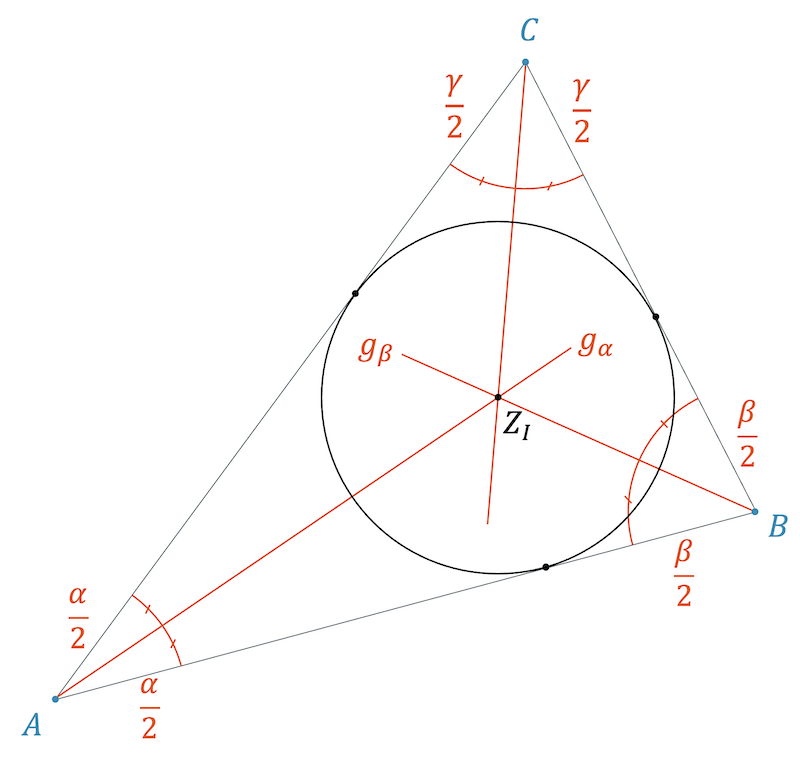 Das Gleiche lässt sich natürlich auch aus Sicht der beiden Dreiecksseiten \(c\) und \(a\) sagen: \(Z_I\) muss auch auf der Winkelhalbierenden \(g_{\beta}\) liegen.