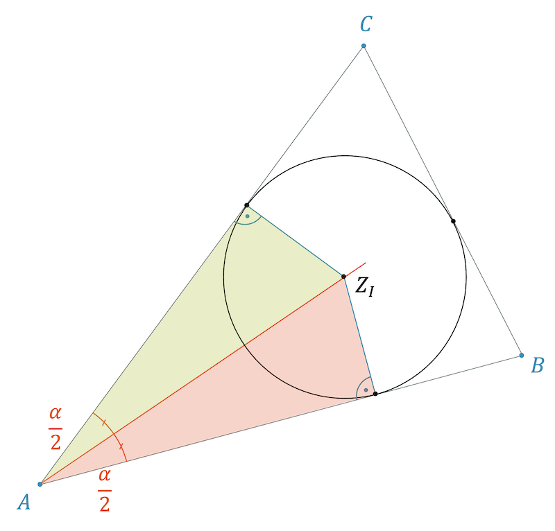 Da das grüne und das rote Dreieck beide den Winkel \(\alpha\) unter sich aufteilen, aber an dieser Stelle den gleichen Winkel haben müssen, ist der Winkel für beide genau \(\frac{\alpha}{2}\). Damit muss \(Z_I\) auf der Winkelhalbierenden liegen: