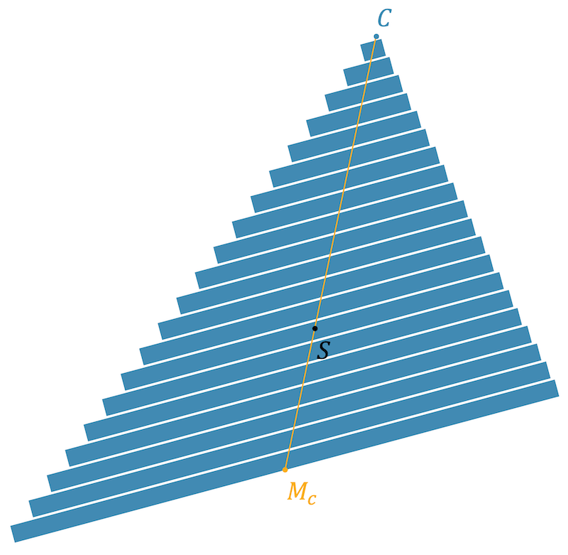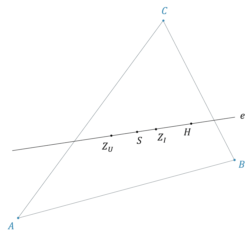 Die beiden Geraden \(g_c\) und \(g_a\) schneiden sich in einem Punkt. Da die beiden Geraden nichts anderes als Punktmengen sind, können wir diese beiden Mengen schneiden und der Schnittpunkt kann nur \(Z_U\) sein, denn \(Z_U\) ist ein Element beider Mengen. Es ist somit der einzige Punkt, der in der Schnittmenge sein kann.