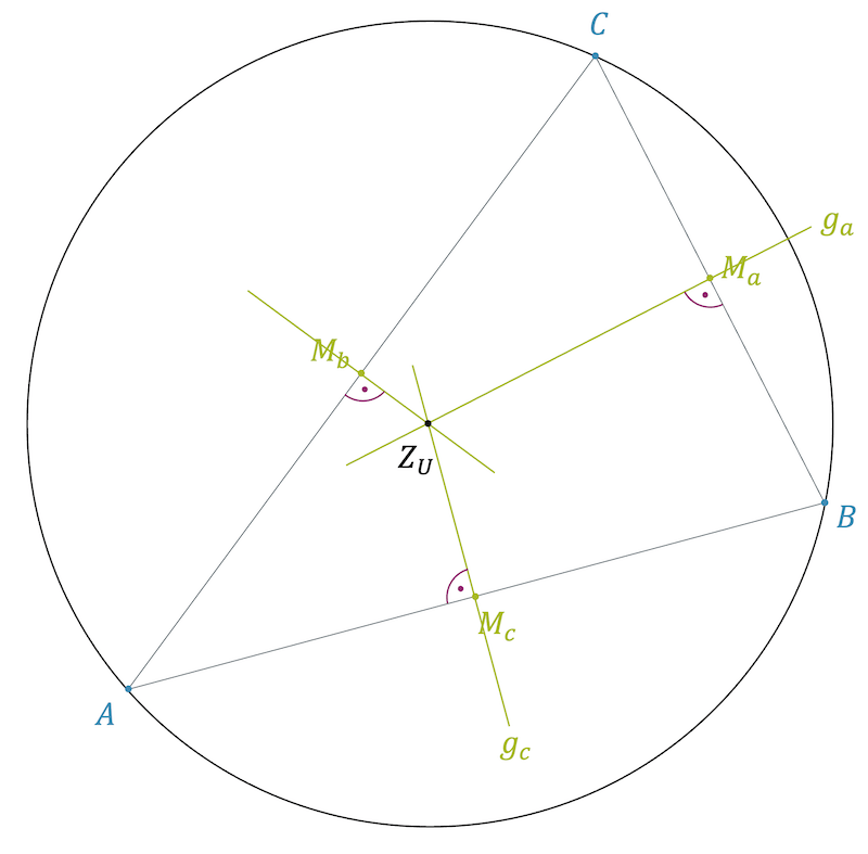 Wir können mit der Seite \(a\) genau gleich vorgehen: Wir erstellen mit der Mittelsenkrechten durch \(M_a\) die Menge aller Punkte, die zu \(B\) und \(C\) den gleichen Abstand haben. Der gesuchte Punkt \(Z_U\) muss auch hier auf dieser Mittelsenkrechten liegen!