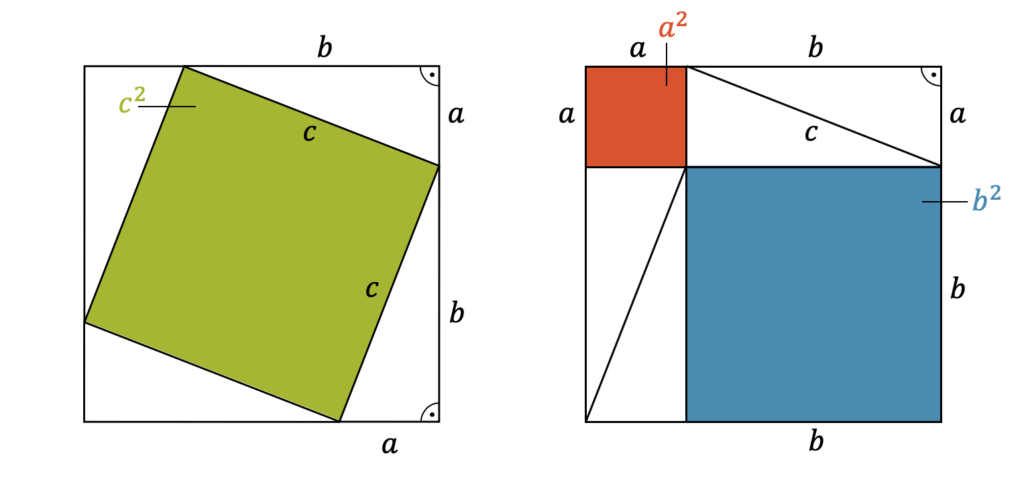 Satz des Pythagoras: Die Summe der Quadrate der beiden Katheten \(a\) und \(b\) ist gleich dem Quadrat der Hypotenuse \(c\):