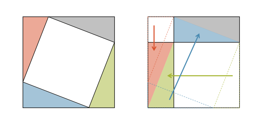 Wenn wir jetzt das grosse Quadrat behalten, aber die vier Dreiecke etwas anders platzieren, erhalten wir zwei quadratische Löcher mit den Flächen \(a^2\) und \(b^2\). Da wir das gleich grosse Quadrat mit den Seiten \((a+b)\) beibehalten haben, wurde das ursprüngliche Loch der Fläche \(c^2\) einfach in zwei separate Quadratflächen umgewandelt. Sie müssen zusammen aber die gleiche Fläche ausmachen wie \(c^2\). Deshalb muss gelten…