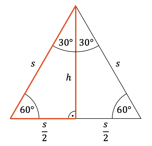 Wir machen eine kleine Skizze eines gleichseitigen Dreiecks mit den Seiten \(s\) und den Winkeln von \(60°\). Wir zeichnen auch die Höhe \(h\) ein.