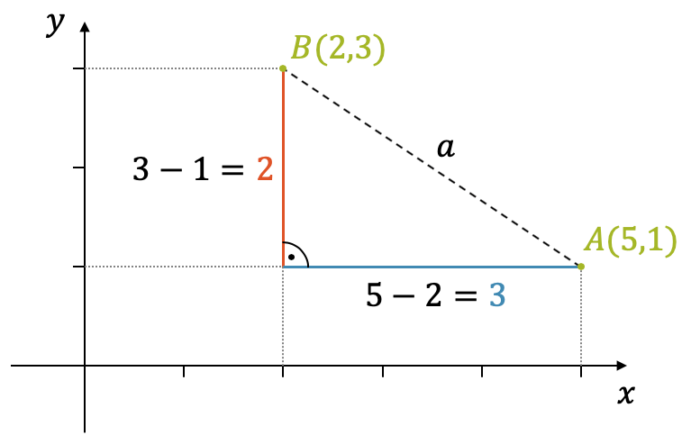 Berechne den Abstand \(a\) zwischen den Punkten A(5,1) und B(2,3).