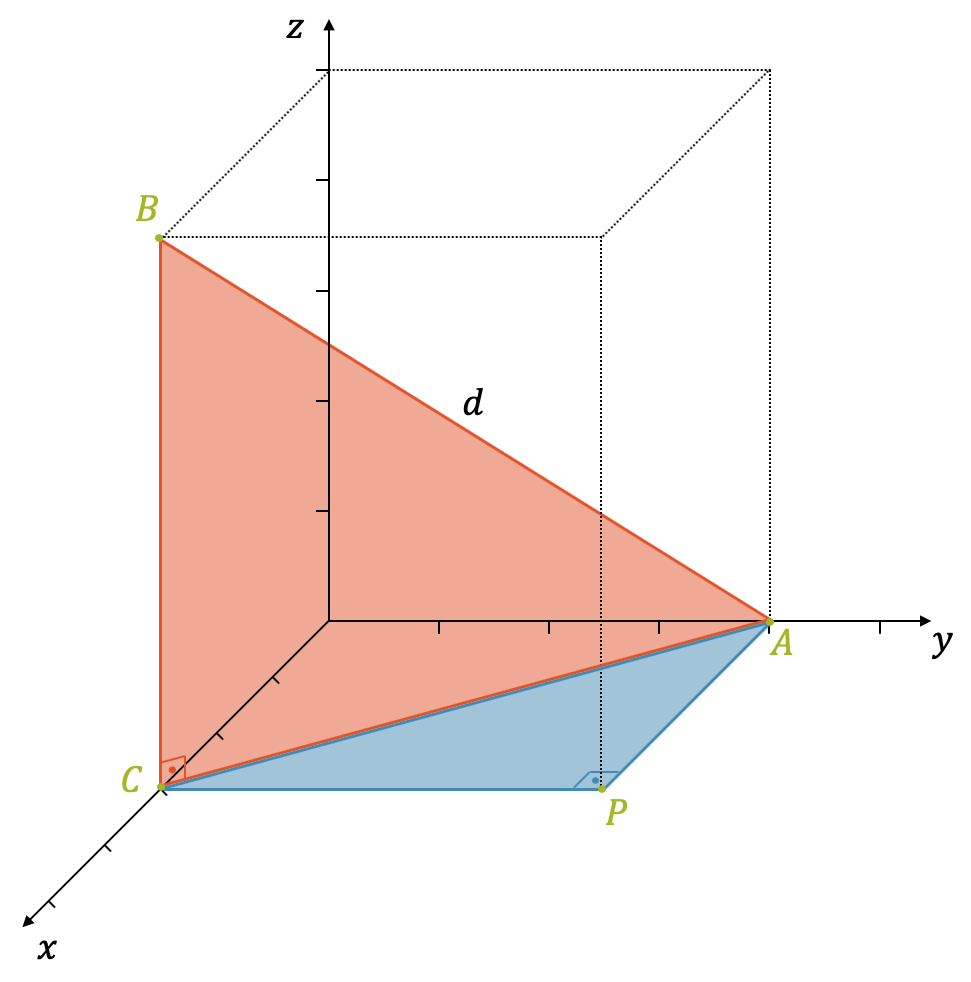 Als Erstes suchen wir ein rechtwinkliges Dreieck, so dass wir den Satz des Pythagoras anwenden können. Das rote Dreieck hat einen rechten Winkel beim Punkt C, denn die Strecke [AC] liegt in der \(x,y\)-Ebene, d.h. auf der “Bodenebene”. Die andere Strecke [CB] ist parallel zur \(z\)-Achse und ist somit senkrecht zur “Bodenebene”. Das rote Dreieck ABC ist deshalb ein rechtwinkliges Dreieck mit den beiden Katheten [AC] und [BC] und der Hypotenuse \(d\). Wenn wir also die Längen der Strecken \(\overline{AC}\) und \(\overline{BC}\) haben, können wir \(d\) mit dem Satz des Pythagoras bestimmen: