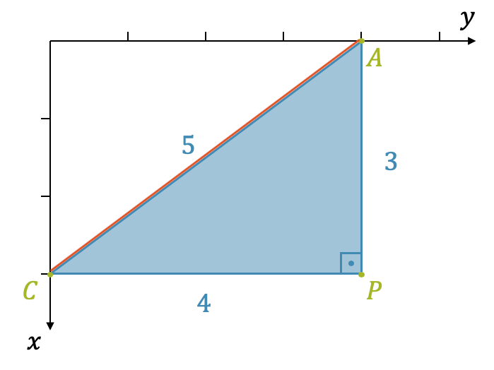 Jetzt sehen wir sehr schön, dass das blaue Dreieck zwei Katheten mit den Längen \(3\) und \(4\) hat, d.h. die Hypotenuse [AC] hat demzufolge die Länge: \(\sqrt{3^2+4^2}=5\).