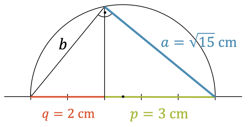 Dann ziehen wir die Höhe hoch und schneiden sie mit dem Thaleskreis über der Hypotenuse. Wir erhalten das rechtwinklige Dreieck mit den beiden Katheten \(a\) und \(b\). Die Kathete \(a\) ist jetzt genau \(\sqrt{15}\,\text{cm}\) lang, da \(a^2 = 15\,\text{cm}^2\). Mit \(a\) haben wir somit die gesuchte Strecke konstruiert.