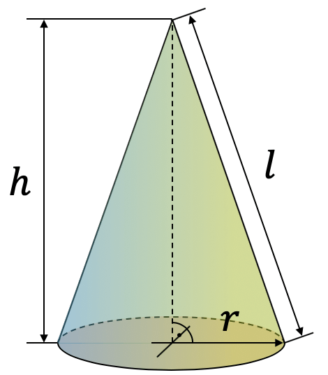 Die Mantelfläche \(A_M\) des Kegels wird mit Hilfe der Mantellinie \(l\) berechnet, die mit dem Satz des Pythagoras aus der Höhe \(h\) und dem Grundkreisradius \(r\) berechnet werden kann: