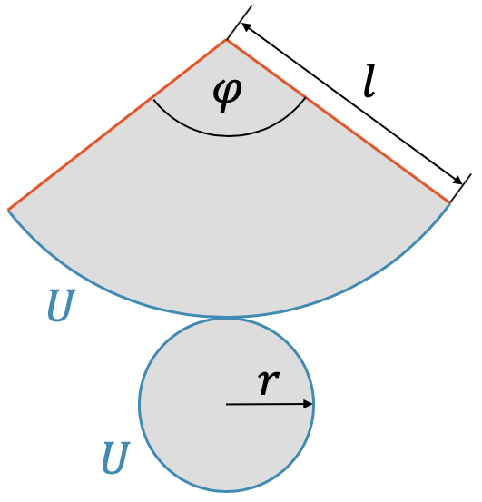 \[ b = \frac{\varphi}{2 \pi} \cdot 2 \pi l \quad \stackrel{!}{=} \quad 2 \pi r = U \]