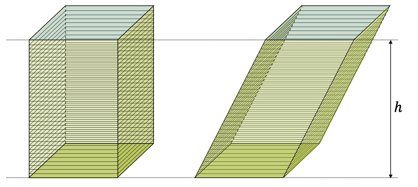Das schräge Prisma hat deshalb das gleiche Volumen wie das gerade Prisma, solange wir die gleiche Höhe und die gleichen Zettel (gleiche Grundfläche) verwenden.