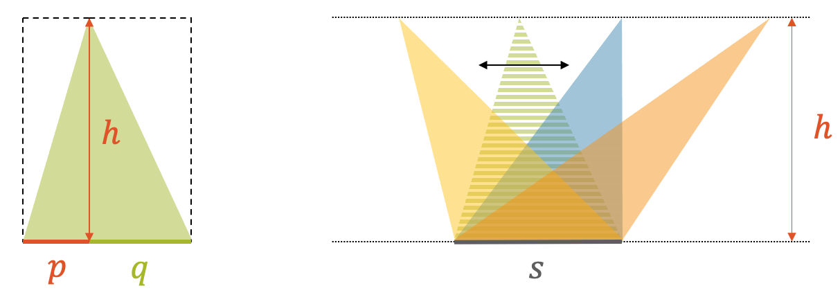 Die Fläche des Dreiecks ist nur abhängig von der Grundfläche \(s=(p+q)\) und der Höhe \(h\), nicht aber vom Winkel!