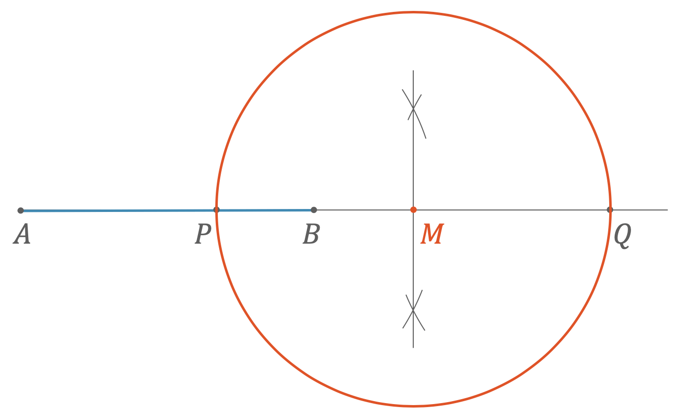 - Halbiere mit dem Zirkel den Abstand \(\overline{PQ}\) und ermittle so das Zentrum \(M\) des Kreises