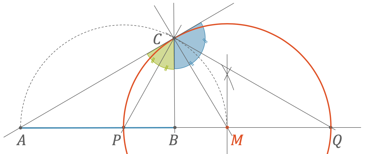 Von diesem Punkt aus schliessen die Verbindungen \(CA\) und \(CB\) einen grünen Winkel ein. Die Verbindung \(CP\) ist die Winkelhalbierende, die den Winkel in der Mitte schneidet. Auf der anderen Seite wird der blaue Winkel durch die Verbindung \(CQ\) halbiert.