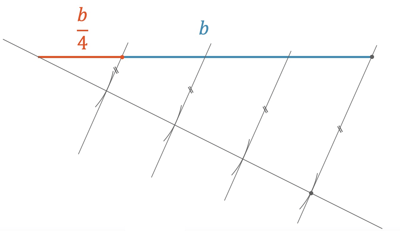 Wir konstruieren einen beliebigen “Schatten” unserer Strecke, die wir teilen möchten. Die Hilfskonstruktion wird in einem beliebigen spitzen Winkel zur Strecke gezeichnet. Nun nehmen wir ein bekanntes Teilstück und vervielfachen dieses Teilstück auf der Hilfsgeraden mit dem Zirkel. Jetzt haben wir z.B. ein Vierfaches des Teilstücks. Der Endpunkt der vervielfachten Strecke wird mit dem Endpunkt der zu teilenden Strecke (blau) verbunden. Diese Verbindung wird parallel durch die Teilpunkte gezogen, so dass die neuen Parallelen die ursprüngliche Strecke schneiden und in gleich grosse Stücke teilen.