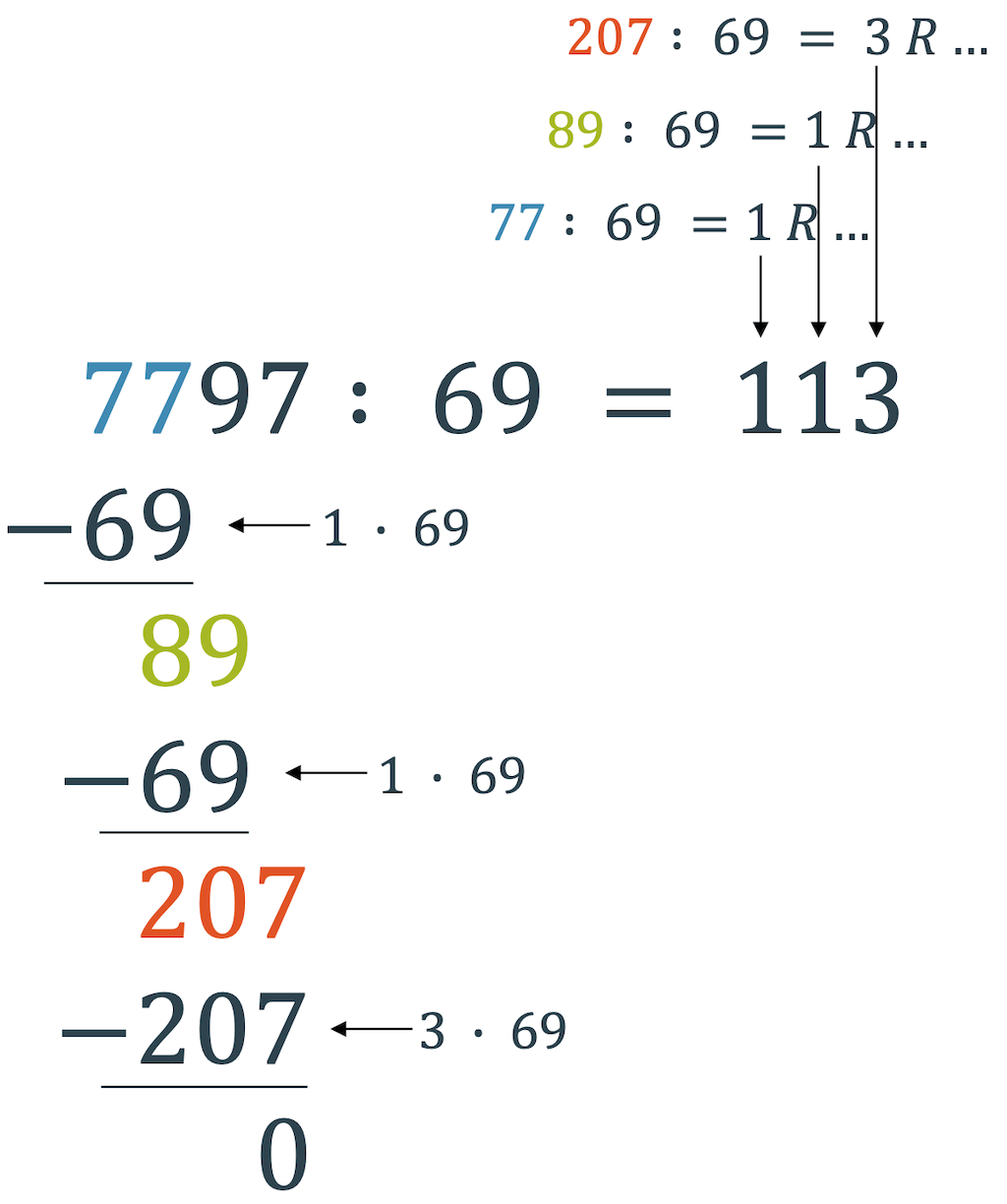 Was gibt 207 durch 69? Das geht genau auf und gibt uns 3. Wir schreiben diese Ziffer hin und erhalten so das Resultat der Division: