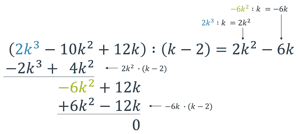 Der Rest beträgt \(-6k^2 \). Jetzt ziehen wir die \(12k \) herunter und erhalten so das nächste Polynom, das wir durch \((k-2) \) teilen müssen: \(-6k^2 + 12k \). Wir schauen uns nur \(-6k^2 \) durch \(k \) an und erhalten \(-6k \). Dieses zweite Teilresultat schreiben wieder rechts hin und multiplizieren zurück: