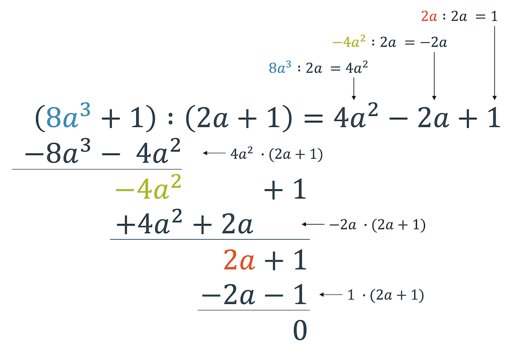 Dieser Rest geteilt durch \((2a+1) \) ergibt natürlich genau das letzte Teilresultat +1, ohne Rest, d.h. wir schreiben jetzt noch +1 zu den Teilresultaten hin und kriegen so die fertige Polynomdivision: