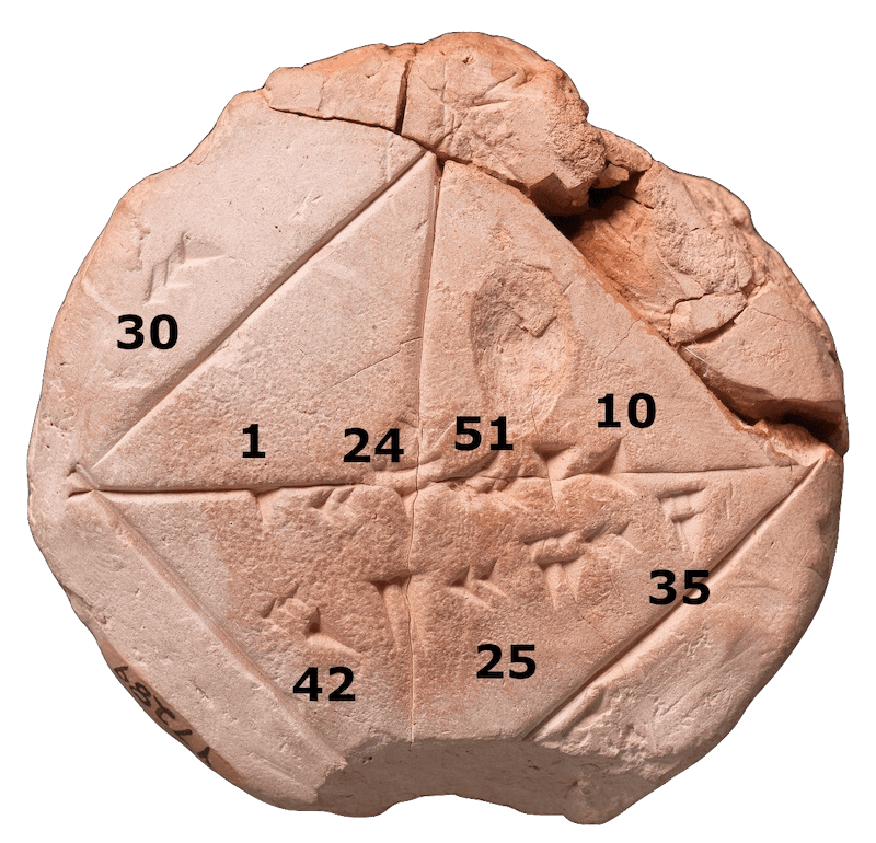 Seine Tontafel ist heute bekannt als “YBC 7289”. Sie enthält die Berechnung im babylonischen Zahlensystem, dem Sexagesimalsystem (Sechzigersystem). Ein paar Reste des Sechzigersystem haben sich übrigens bis heute gehalten: Wir haben 60 Sekunden in einer Minute und 60 Minuten in einer Stunde. Auch die genauen Winkelangaben kennen noch die Minuten und Sekunden.