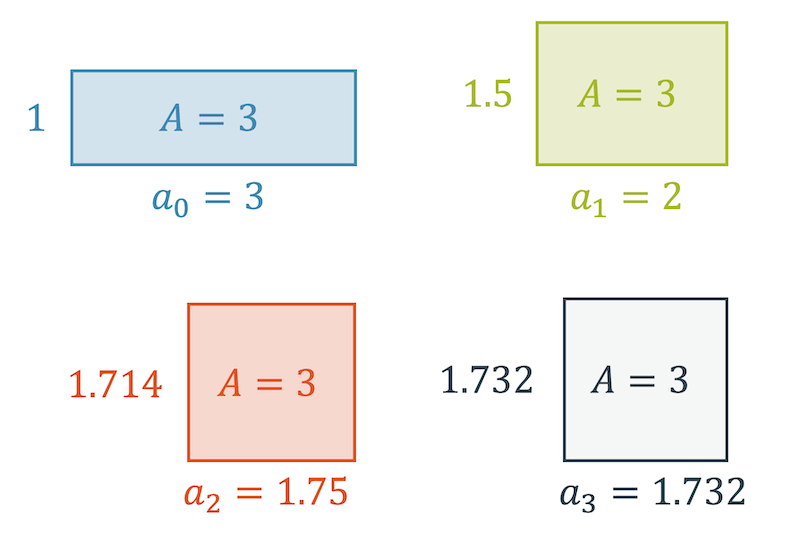 Unser Rechteck (1 \(\times\) 3) ist noch ein sehr schlechtes “Quadrat”: Die Seite mit der Länge 1 ist zu kurz und die Seite mit Länge 3 ist zu lang. Die Lösung muss irgendwo zwischen 1 und 3 liegen.