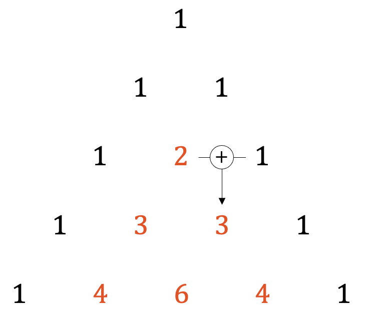 Jeder Koeffizient, ausser die Einsen am Rand, werden durch die Summe der beiden Koeffizienten über ihnen berechnet. Diese Zahlen hängen auch mit dem Binomialkoeffizienten zusammen und zwar sind es die Ergebnisse von verschiedenen Binomialkoeffizienten gemäss folgender Abbildung: