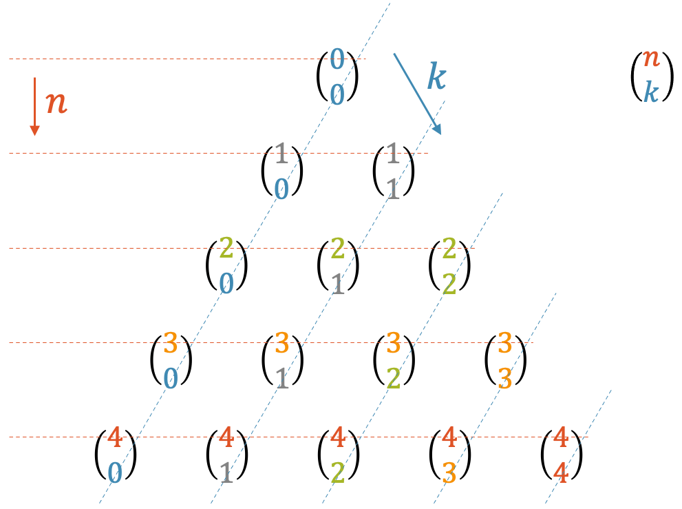 Die untere Zahl \(k\) entspricht quasi einer “horizontalen Koordinate” die mit dem Abstand von der linken Dreieckskante zunimmt.