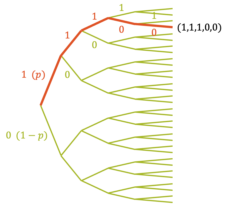 \[ P(1,1,1,0,0) \;\;=\;\; p \cdot p \cdot p \cdot (1-p) \cdot (1-p) \;\;=\;\; p^3 \cdot (1-p)^2 \]